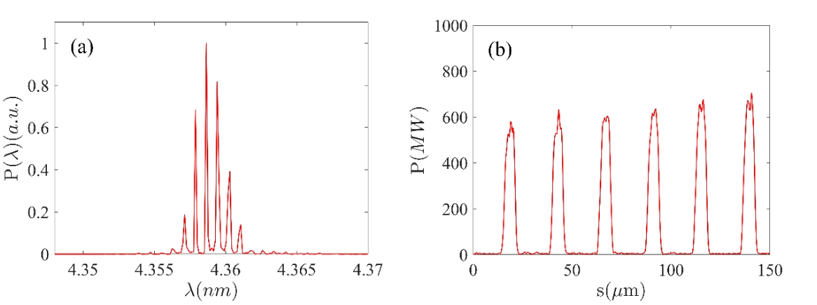 通過根據公式2調整兩束激光脈沖的線性啁啾和時間延遲,經過傅里葉變換后將出現相同的頻率分量,此時XFC脈沖可以被放大。這種調整使我們能夠實現與傳統鎖模激光器相當的效果。為了驗證該方法的準確性和有效性,研究人員根據公式2進行了N=1的模擬。XFC功率和光譜的輻射結果如圖3所示。峰值功率接近600 MW,中心波長約為4.36 nm,進入水窗區域。顯然,已經實現了高效的鎖模放大和XFC的生成。