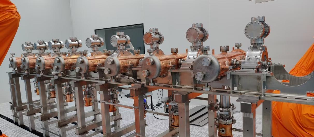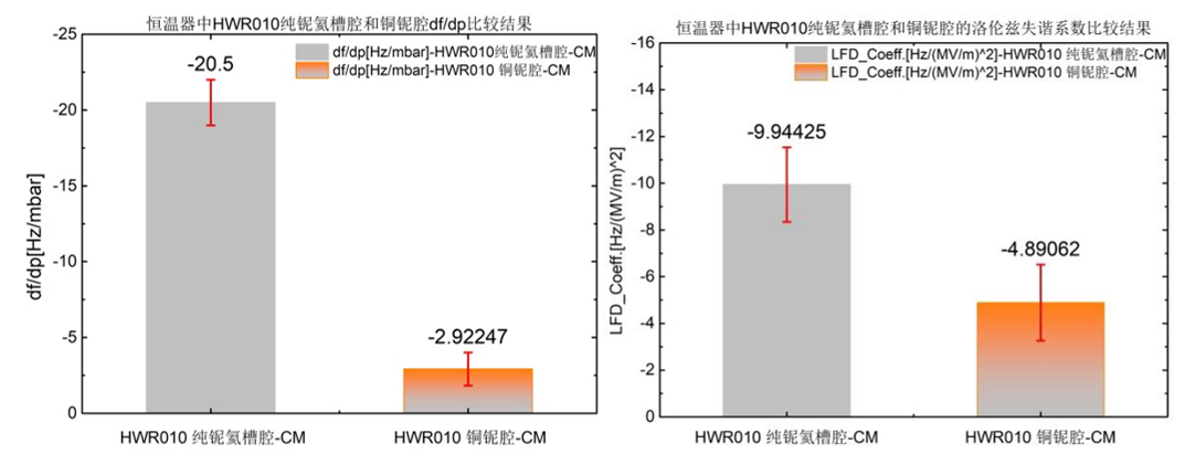 該超導加速單元由9支半波長型銅鈮復合超導腔組成。在4.2K的低溫測試環境中,銅鈮復合超導腔的平均表面峰值電場達到35MV/m,平均腔體頻率洛倫茲失諧系數和平均腔體頻率氦壓敏感系數分別降至約-4.9Hz/(MV/m)²和-2.9Hz/mbar,是原純鈮超導腔單元對應值的50%和15%,各項性能顯著優于原純鈮超導腔加速單元。