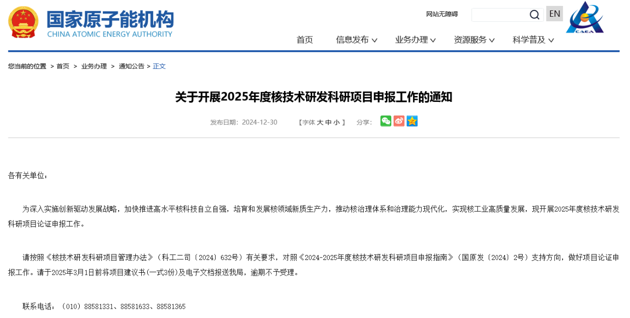 近日,國家原子能機(jī)構(gòu)官網(wǎng)發(fā)布了《關(guān)于開展2025年度核技術(shù)研發(fā)科研項目申報工作的通知》。全文如下。