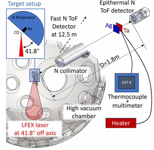 本研究利用高功率激光驅動的中子源,結合飛行時間中子光譜技術,設計了一套用于測量材料內部溫度的實驗方案。實驗選用銀(Ag)和鉭(Ta)薄膜作為樣品,其中銀薄膜(厚度0.2 mm)保持室溫,作為中子能量參考;鉭薄膜(厚度0.1 mm)則被加熱至不同溫度(T = 361、413、474、573、617 K),用于研究材料溫度變化導致的中子共振吸收多普勒展寬效應。實驗裝置如圖1所示,采用大阪大學激光工程研究所的高功率激光系統(LFEX),通過1.5皮秒激光脈沖聚焦于厚度為5μm的氘化聚苯乙烯靶材。激光作用于靶材表面后,驅動高能質子和中子的產生,隨后這些粒子與鈹(Be)靶材發生核反應,生成數十兆電子伏能量的快中子。這些中子經過由高密度聚乙烯制成的圓柱形中子減速器后,被冷卻至eV能量范圍,從而適用于中子共振吸收測量。