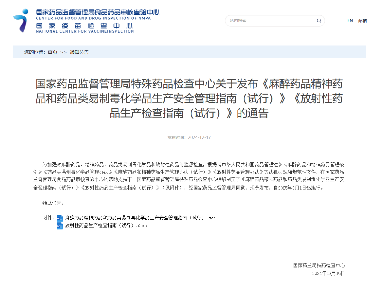 為加強對麻醉藥品、精神藥品、藥品類易制毒化學品和放射性藥品的監督檢查,根據《中華人民共和國藥品管理法》《麻醉藥品和精神藥品管理條例》《藥品類易制毒化學品管理辦法》《麻醉藥品和精神藥品生產管理辦法(試行)》《放射性藥品管理辦法》等法律法規和規范性文件,在國家藥品監督管理局食品藥品審核查驗中心的幫助支持下,國家藥品監督管理局特殊藥品檢查中心組織制定了《麻醉藥品精神藥品和藥品類易制毒化學品生產安全管理指南(試行)》《放射性藥品生產檢查指南(試行)》(見附件),經國家藥品監督管理局同意,現予發布,自2025年3月1日起施行。
