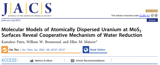 Matson教授團隊聚焦于鈾(U)在水還原反應中的作用機制,通過分子模型研究了鈾原子在二硫化鉬(MoS2)表面上的分散狀態,成功揭示了其在水還原反應中的協同機制。通過合成一系列鈾配合物作為模型,成功分離并表征了U-氫氧化物中間體,深入探究其反應路徑,揭示鈾與金屬配體協同作用于水活化過程,同時對U-O代類似物的形成及穩定性進行研究,為理解鈾在MoS?表面催化水還原反應提供關鍵原子層面視角,助力鈾基催化劑研究發展。該工作由Kamaless Patra, William W. Brennessel, 和 Ellen M. Matson共同撰寫,以“Molecular Models of Atomically Dispersed Uranium at MoS2 Surfaces Reveal Cooperative Mechanism of Water Reduction”為題,發表在《JACS》上。