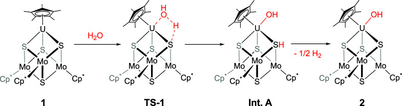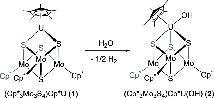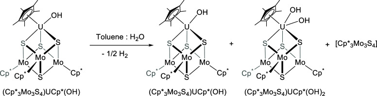 要點1:水與鈾配合物反應研究。作者研究了低價鈾氫氧化物形成 。首先研究了作者先前報道的還原鈾簇(Cp*3Mo3S4)Cp*U(1)與水的反應性,將該化合物作為沉積在MoS2納米片(U@MoS2)基面上的單個U原子的分子類似物。再向該化合物的苯溶液中加入一定當量的水,形成鈾-羥基簇合物(Cp*3Mo3S4)Cp*U(OH)。最后向鈾-羥基簇合物中加等量水,在非配位溶劑中生成新產物(Cp?Mo?S?)CpU (OH)?。