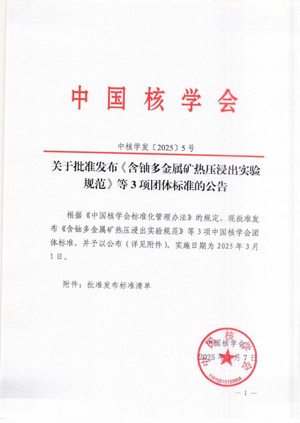 2025年1月7日,中國核學會發布關于批準發布《含鈾多金屬礦熱壓浸出實驗規范》等3項團體標準的公告。根據《中國核學會標準化管理辦法》的規定,現批準發布《含鈾多金屬礦熱壓浸出實驗規范、》《海水提鈾材料吸附一解吸性能測試方法》、《硬巖鈾礦連續采礦深孔爆破安全規范》中國核學會團體標準。實施日期為2025年3月1日。