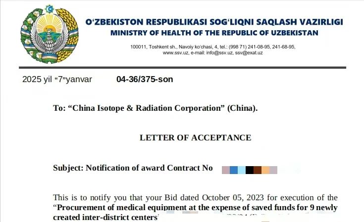 2025 年1月7日,烏茲別克斯坦傳來喜訊,中國同輻北京分公司在國際競標中脫穎而出,成功中標烏茲別克斯坦衛生部急診中心服務項目,迎來 “開門紅”。