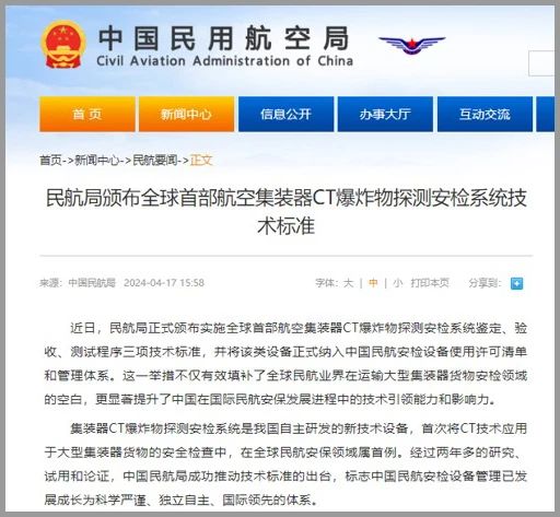 2024年4月,民航局頒布全球首部航空集裝器CT爆炸物探測安檢系統技術標準,并將該類設備正式納入中國民航安檢設備使用許可清單和管理體系。 這一舉措不僅有效填補了全球民航業界在運輸大型集裝器貨物安檢領域的空白,更顯著提升了中國在國際民航安保發展進程中的技術引領能力和影響力。