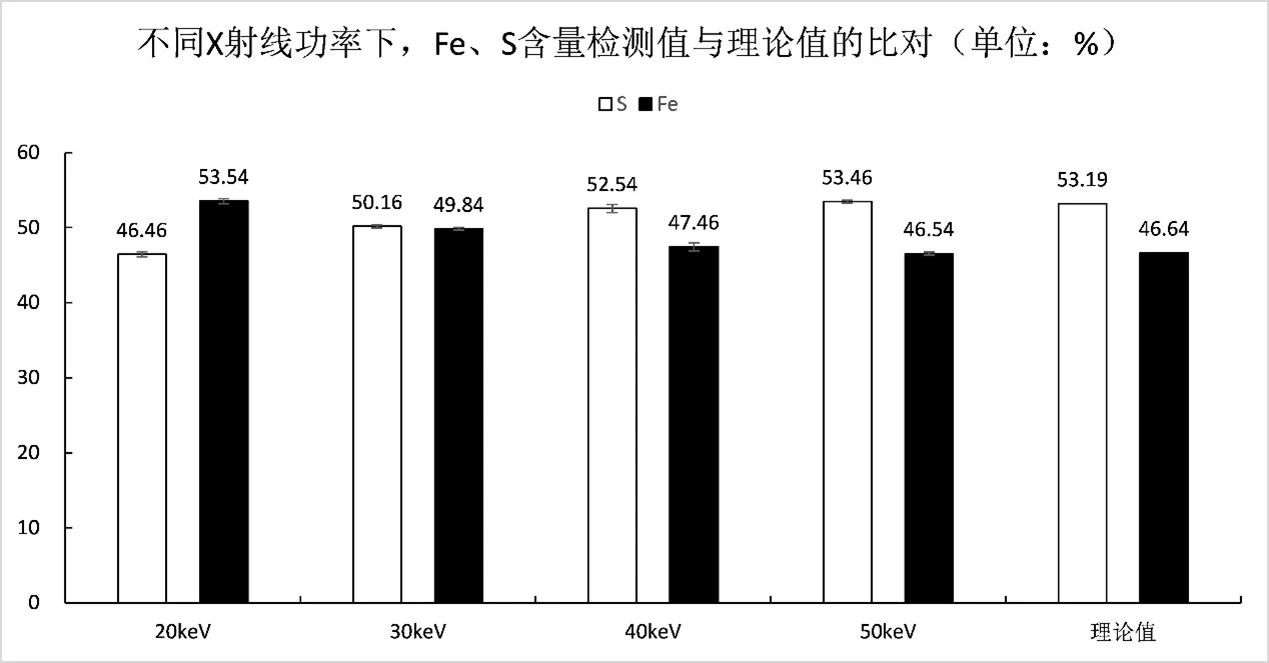 圖4 不同X射線功率下對(duì)黃鐵礦標(biāo)樣中硫、鐵元素定量檢測(cè)的結(jié)果與理論值的比對(duì)