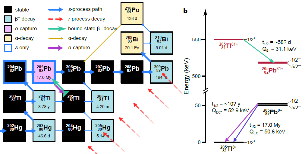 圖:鉈-205和鉛-205在天體環境中元素合成過程的路徑及相關能級信息。左圖表示與鉈-205和鉛-205相關的慢中子俘獲過程路徑(藍色箭頭)以及其它核衰變路徑。右圖顯示了鉈-205和鉛-205在不同電離狀態下的能級關系。