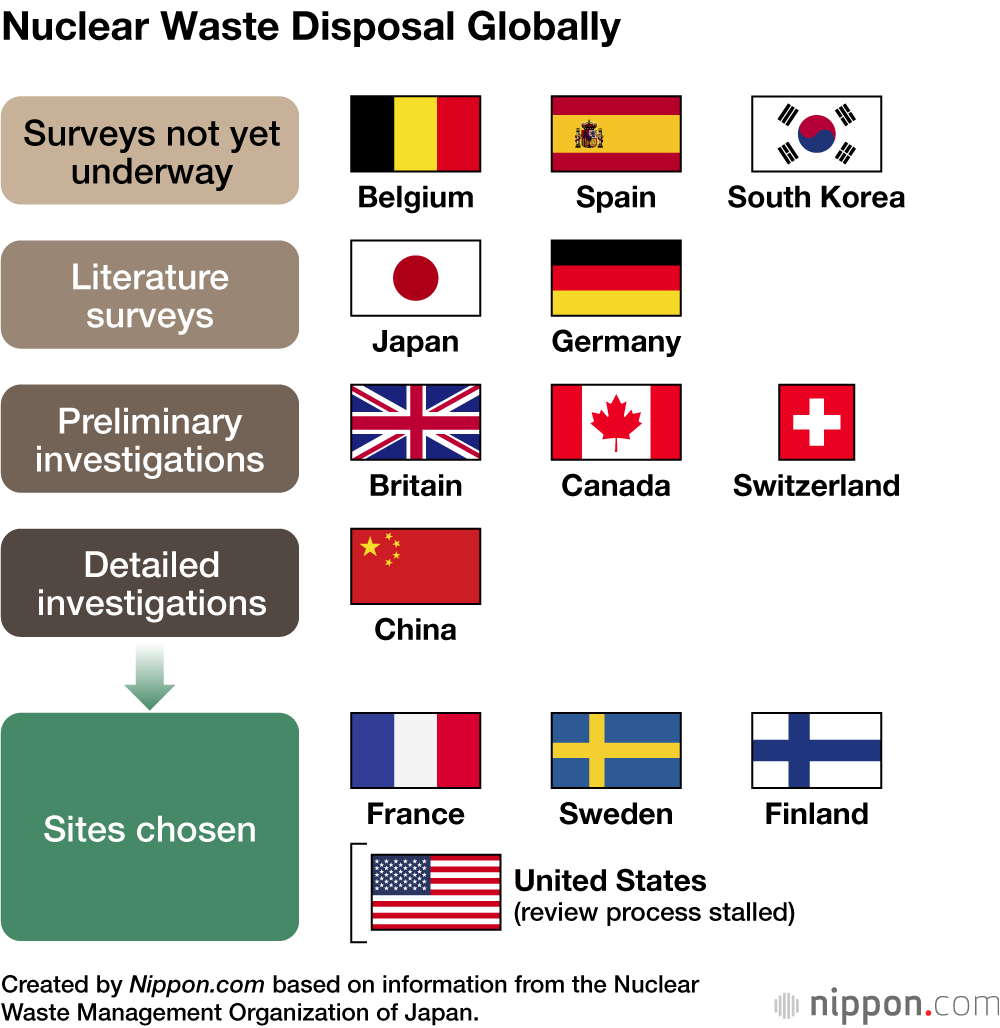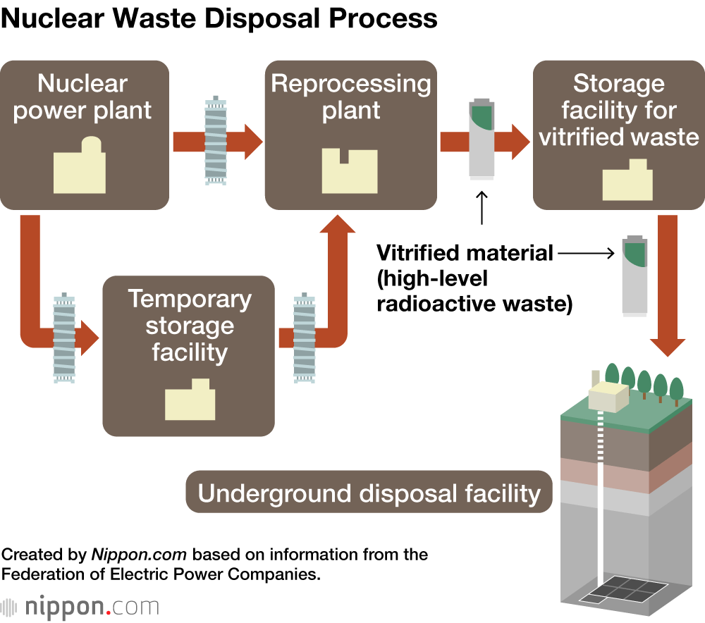 日本政府和核電站運營商長期以來一直在努力解決如何處理廢燃料和其他高放射性廢物的問題。當局最終決定將廢物埋入地下 300 米或更深的設施中。2002 年,日本核廢料管理組織 (NUMO) 開始尋找儲存地點,邀請各市政府將自己列為候選地點。到目前為止,這項“志愿者”政策只有三個參與者,即北海道的壽都町和神惠內町以及佐賀縣的玄海町。