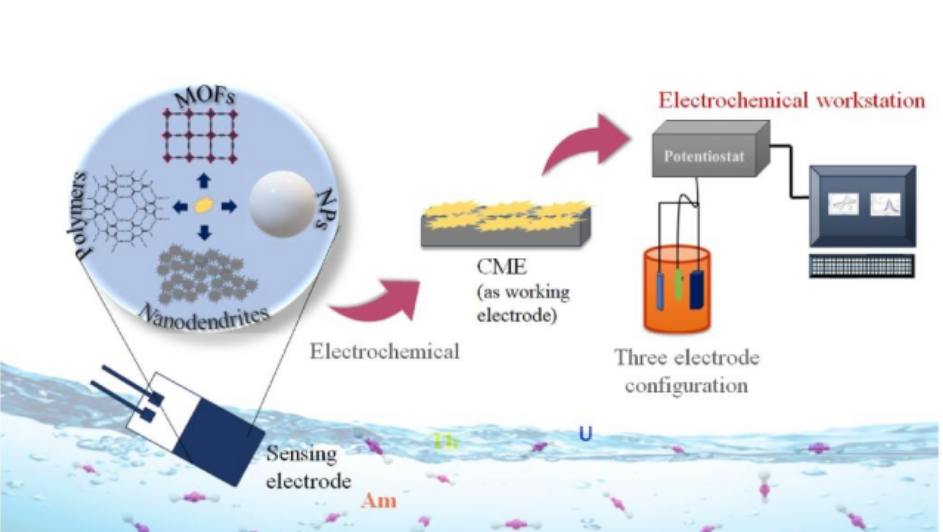 電化學傳感器作為一種新興的檢測技術手段,具備諸多獨特優勢。它具有便攜性,易于攜帶至現場進行檢測;操作簡便,無需復雜的專業操作技能;成本低廉,可降低檢測成本。此外,電化學傳感器的選擇性和靈敏度能夠通過對電極的修飾得到顯著提升。通過在電極表面修飾碳糊(CP)、鉑(Pt)、金(Au)、硼摻雜金剛石電極(BDDE)、玻璃碳(GC)、石墨(GR)等材料,并結合石墨烯、碳納米管(CNTs)等納米材料,能夠改變電極的表面性質,增強其對放射性核素的吸附、催化等作用,從而提高檢測性能。基于以上情況,有必要對電化學傳感器在放射性核素檢測中的應用進行深入研究,系統總結其檢測機制、方法、性能等方面的進展,為開發更高效、準確、便捷的放射性核素檢測技術提供理論依據與實踐參考,以滿足環境保護、核安全監測等領域對放射性核素檢測日益增長的需求。