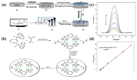 圖2.(a) 修飾電極制備的圖示;(b) 萃取和再結合機制;(c, d) 不同UO?²?組成下IIP/GR/CPE的差分脈沖伏安(DPV)結果以及改性電極(IIP/GR/CPE)的校準曲線。