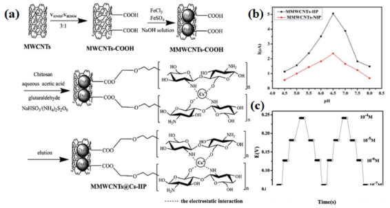 圖3.(a) 多壁碳納米管@銫-離子印跡聚合物(MMWCNT@Cs-IIP)制備過程的圖示;(b) 當暴露于濃度為1.0×10-4 M的銫離子時,pH對優化傳感器電流輸出的影響;(c) 改性電極的重復性。