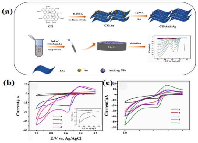 圖4.(a)CG/Au@Ag納米復合材料的制備和制造過程的圖示;(b,c)修飾電極的循環伏安曲線。