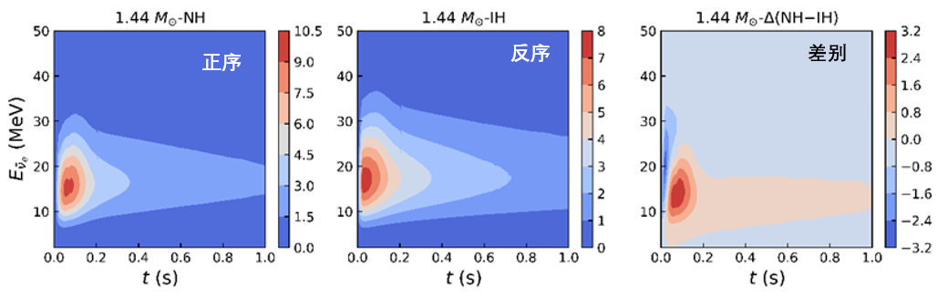 研究結(jié)果發(fā)現(xiàn),在超新星爆發(fā)的最初1秒內(nèi),中微子質(zhì)量順序會(huì)影響中微子振蕩過(guò)程中轉(zhuǎn)化為電子型反中微子的概率。這導(dǎo)致地球上的超新星中微子信號(hào)與中微子質(zhì)量順序、原中子星的質(zhì)量之間存在密切關(guān)聯(lián),因此可以通過(guò)超新星中微子信號(hào)的時(shí)間序列,來(lái)推測(cè)不同中微子質(zhì)量順序下原中子星的質(zhì)量。由于原中子星的質(zhì)量可通過(guò)天文學(xué)手段進(jìn)行較精準(zhǔn)的測(cè)量,因此將反推出的質(zhì)量與測(cè)量結(jié)果對(duì)比,就可以確定中微子的質(zhì)量順序。這一成果為將來(lái)中微子大科學(xué)裝置的建設(shè),以及超新星中微子的測(cè)量提出了指導(dǎo)性的建議。