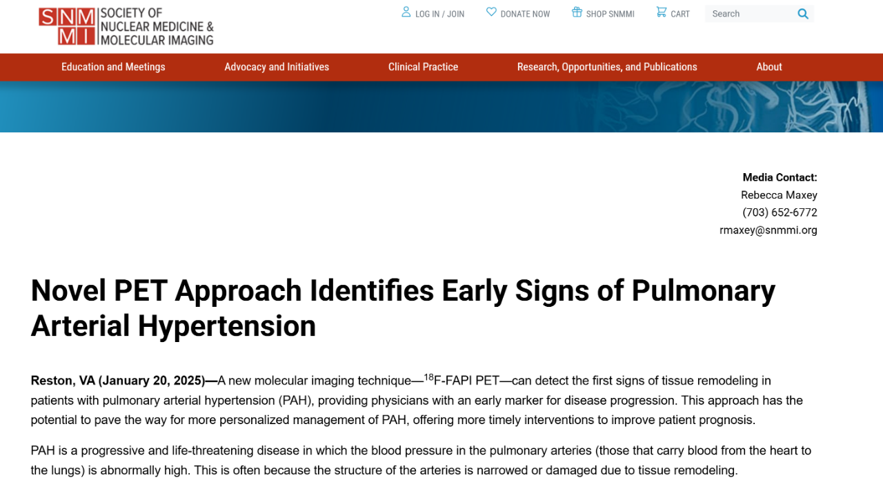 該研究被核醫學頂級期刊《J Nucl Med》雜志選作為當期封面圖像(Cover Image)以及當月專題文章(Featured Article of the month)予以重點推薦。同時,該研究被SNMMI網站作為Press release報告“Novel PET Approach Identifies Early Signs of Pulmonary Arterial Hypertension”進行推薦(新型PET方法可識別肺動脈高壓的早期征象),引起社會廣泛關注。