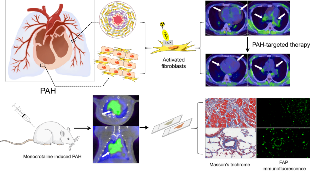 動脈性肺動脈高壓(PAH)是一種致命的肺血管疾病,其特征是肺血管重塑導致肺血管阻力增加,肺動脈壓力升高,最終導致右心室肥厚和重構,最終導致患者右心衰竭和死亡。纖維化是 PAH 患者心肌和肺血管重塑的共同病理生理特征,會引發心功能障礙并導致疾病進展,但現有影像學技術對早期纖維化的檢測和動態監測仍然存在局限。