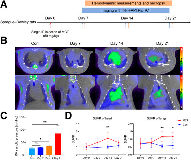 ▲圖1:PAH進展過程和MCT大鼠心肌及肺部的18F-FAPI攝取時間過程。0 2