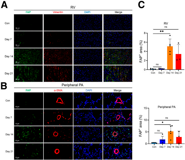 ▲圖3:MCT大鼠右心室(RV)和外周肺動脈(PA)的FAP免疫熒光染色。
