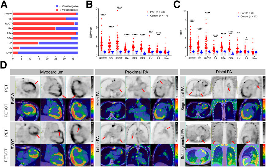 (2)前瞻性連續納入38名符合2022年 ESC/ERS肺動脈高壓診斷與治療指南的PAH患者行18F-FAPI 胸部PET/CT檢查。并與右心導管參數、心臟彩超和臨床指標進行相關性分析。