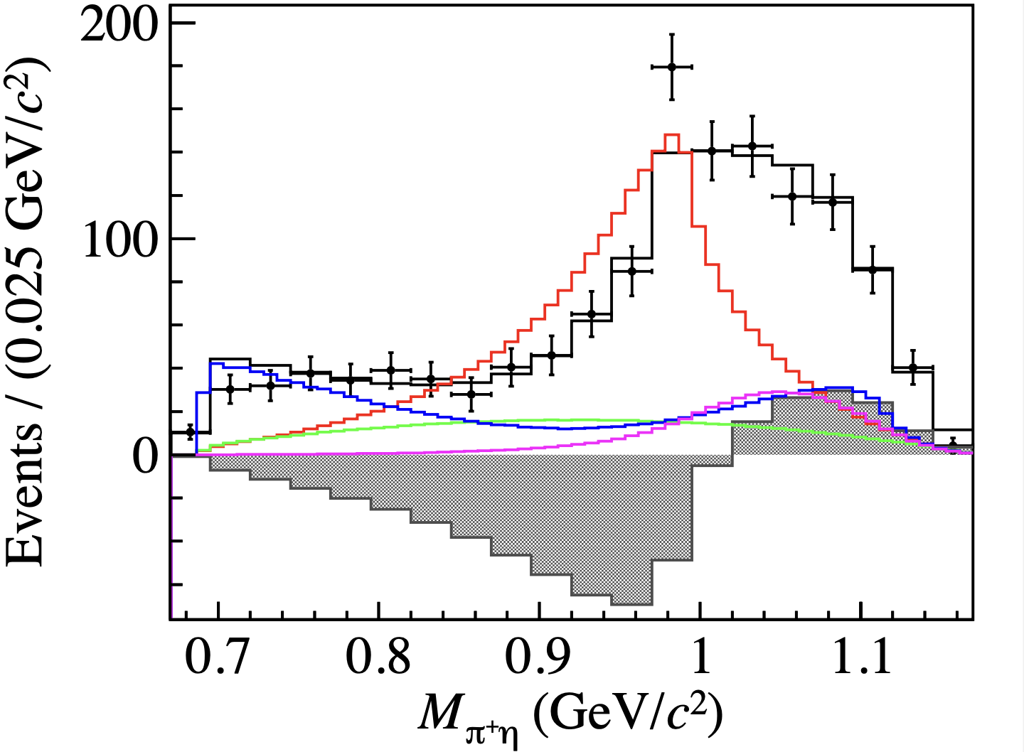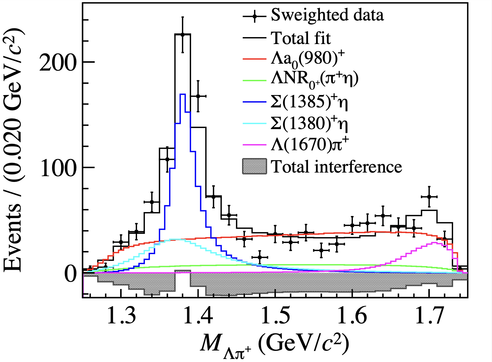 在微觀世界中,夸克通過(guò)強(qiáng)相互作用力束縛形成強(qiáng)子。根據(jù)夸克模型,自然界存在兩類(lèi)常規(guī)強(qiáng)子:兩個(gè)夸克組成的介子(如π介子)和三個(gè)夸克組成的重子(如質(zhì)子和中子)。此外,理論還預(yù)測(cè)了更加復(fù)雜的強(qiáng)子結(jié)構(gòu),例如:四夸克或五夸克以緊致形式結(jié)合而成的強(qiáng)子態(tài);強(qiáng)子-強(qiáng)子間松散結(jié)合形成的強(qiáng)子分子態(tài)。這些非常規(guī)粒子被統(tǒng)稱(chēng)為奇特強(qiáng)子態(tài),對(duì)它們的研究有助于深化對(duì)強(qiáng)相互作用理論的理解和檢驗(yàn)。輕標(biāo)量介子a0(980)+是粒子物理研究中的受到最廣泛關(guān)注的奇特強(qiáng)子態(tài)之一。然而,學(xué)界對(duì)其內(nèi)部性質(zhì)尚存爭(zhēng)議,包括兩夸克介子、緊致四夸克態(tài)、以及閾值效應(yīng)等不同理論解釋。另一方面,基態(tài)負(fù)宇稱(chēng)的超子Σ(1380)+也是一種奇特強(qiáng)子態(tài),其內(nèi)部可能由五個(gè)夸克組成,但此前從未被實(shí)驗(yàn)直接觀測(cè)到。理論上,粲重子Λc+的兩種特定衰變模式(Λc+→Λa0(980)+和Λc+→Σ(1380)+η)為研究上述奇特強(qiáng)子態(tài)提供了新途徑。早在2019年,研究團(tuán)隊(duì)已在BESIII實(shí)驗(yàn)上首次測(cè)量了Λc+→Λπ+η過(guò)程的絕對(duì)衰變分支比,并在Λπ+不變質(zhì)量譜上發(fā)現(xiàn)Σ(1385)+粒子。然而,由于當(dāng)時(shí)實(shí)驗(yàn)數(shù)據(jù)量的限制,其他可能的中間共振態(tài)未能得到系統(tǒng)研究。在2020-2021年期間,BESIII實(shí)驗(yàn)在正反Λc對(duì)質(zhì)量閾值附近采集了約10倍于以往的數(shù)據(jù)。本次研究成果正是基于這些新的實(shí)驗(yàn)數(shù)據(jù)完成的。