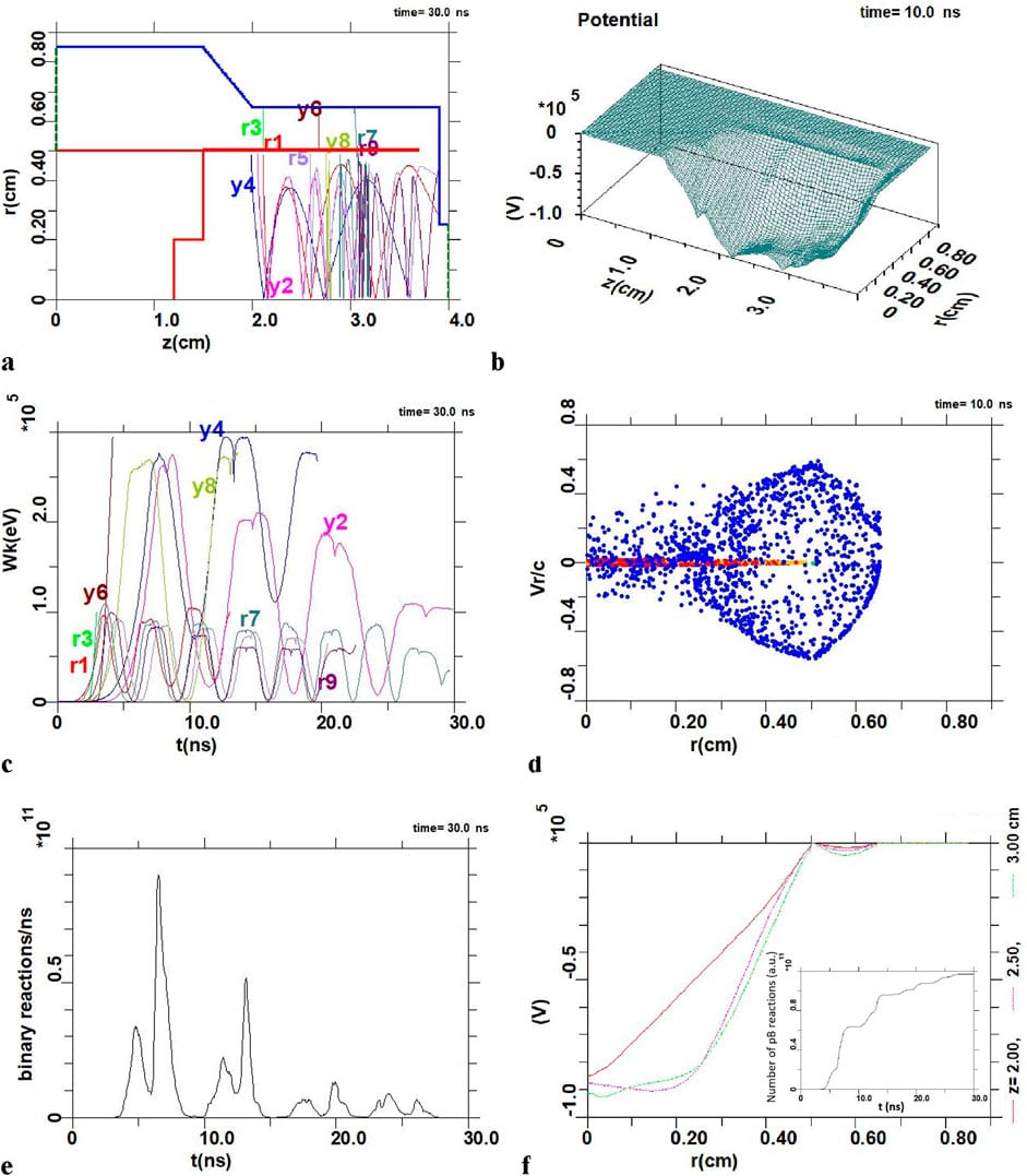(a)t = 30 ns 期間陽極的幾何形狀以及陽極空間中選定的質子組(索引 r)和硼離子(y)的軌跡; (b)t = 10 ns 時虛擬陰極的勢阱; (c) 選定的質子群和硼離子在振蕩過程中的能量隨時間的變化; (d)所有粒子(包括質子-硼聚變反應產物)的速度隨其半徑位置的變化。由于陽極空間中電子的減速和加速,在r≤0.25cm的區(qū)域內形成虛擬陰極; (e)基于粒子內模擬結果的合成反應數(shù)量隨時間的變化; (f)三個固定值z=2.0時沿半徑的電位變??化; t = 10 ns 時放電軸上的 2.5 和 3.0 厘米 / Frontiers in Physics