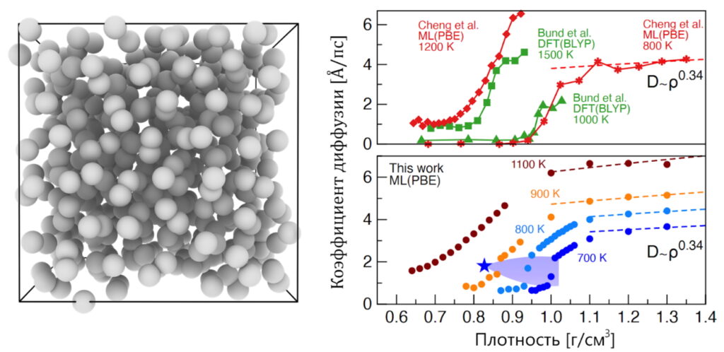 圖 1. 左側是所研究的氫模型的可視化,右側上部是 Cheng 等人的作品中擴散系數對不同溫度下密度的依賴關系。 2020(紅色)和 Bund 等人。顯示 2021(綠色)。本研究獲得的結果顯示在底部。在700K,800K和900K時擴散系數急劇增大,表明分子鍵解離,原子遷移率急劇增加。在 1100 K 時,不再觀察到擴散系數的跳躍,這表明已超過臨界點(用藍色星號標記)。來源:© Nikolay Kondratyuk