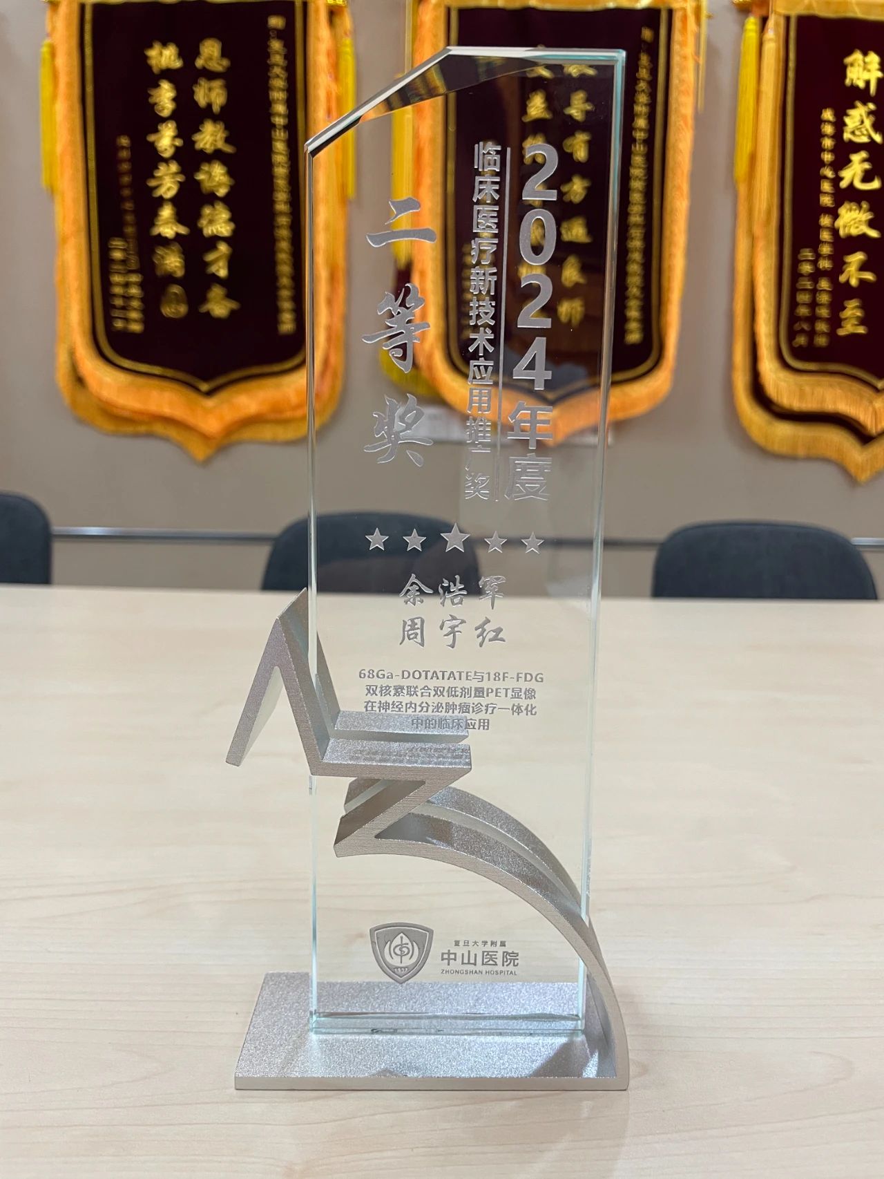 2025 年 1 月 26 日,在復旦大學附屬中山醫院年度工作會議上,一則喜訊傳來:由核醫學科與腫瘤內科共同申報的《68Ga-DOTATATE與18F-FDG雙核素聯合雙低劑量PET顯像在神經內分泌腫瘤診療一體化中的臨床應用》,在素有 “中山諾貝爾” 之稱的臨床醫療新技術應用推廣獎評審中斬獲二等獎。這是核醫學科由石洪成主任牽頭分別獲得一、二、三等獎和提名獎后,核醫學團隊再次獲得二等獎。本次獎項的申報也是石洪成主任在核醫學科可持續發展方面的一個具體舉措。