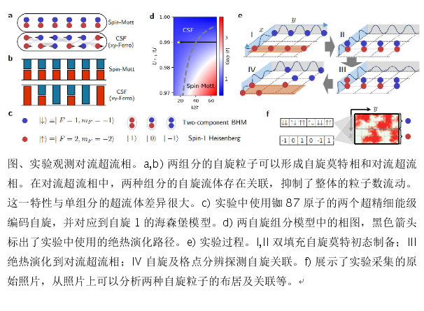 21世紀(jì)初,Kuklov等在理論上提出了對流超流的設(shè)想:與一般的超流體不同,對流超流相存在兩個相對流動的超流體,分別由自旋為A和B的粒子組成;兩種自旋的粒子會相對流動,體現(xiàn)出超流性;兩種相對流動的自旋流之間存在嚴(yán)格的關(guān)聯(lián),使得總粒子流為零,因此整體上看不存在流動性,而是形成莫特絕緣體。對流超流態(tài)的制備需要極低溫度,其觀測更需要單原子自旋可分辨的測量能力。這些實(shí)驗(yàn)技術(shù)挑戰(zhàn)使得此類超流性與絕緣性共存的新奇物態(tài)尚未被實(shí)驗(yàn)證實(shí)。