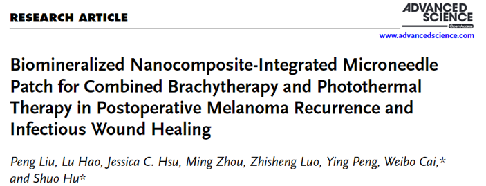 近期,中南大學(xué)湘雅醫(yī)院核醫(yī)學(xué)科(PET中心)/國(guó)家衛(wèi)健委納米生物技術(shù)重點(diǎn)實(shí)驗(yàn)室主任胡碩教授團(tuán)隊(duì)分別在《Advanced Science》雜志(中科院1區(qū)Top期刊,IF=14.3)和《Biomaterials》(中科院1區(qū)Top期刊,IF=12.8)發(fā)表題為《Biomineralized Nanocomposite-Integrated Microneedle Patch for Combined Brachytherapy and Photothermal Therapy in Postoperative Melanoma Recurrence and Infectious Wound Healing》和《A177Lu-nucleotide Coordination Polymer-incorporated Thermosensitive Hydrogel with Anti-inflammatory and Chondroprotective Capabilities for Osteoarthritis Treatment》的原創(chuàng)性研究。國(guó)家衛(wèi)健委納米生物技術(shù)重點(diǎn)實(shí)驗(yàn)室劉鵬副研究員和核醫(yī)學(xué)科(PET中心)郝璐博士為前一篇論文的共同第一作者,胡碩教授和美國(guó)威斯康星大學(xué)蔡偉波教授為共同通訊作者。劉鵬副研究員和核醫(yī)學(xué)科(PET中心)副主任技師周明為后一篇論文的共同第一作者,胡碩教授和湘雅藥學(xué)院周文虎教授為共同通訊作者,中南大學(xué)湘雅醫(yī)院為兩篇論文的第一單位和第一通訊單位。