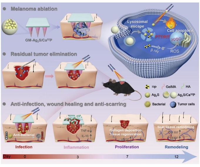 《Biomineralized Nanocomposite-Integrated Microneedle Patch for Combined Brachytherapy and Photothermal Therapy in Postoperative Melanoma Recurrence and Infectious Wound Healing》研究中設(shè)計(jì)了一種多功能納米復(fù)合微針貼片,通過近距離放療和光熱治療協(xié)同抑制黑色素瘤術(shù)后復(fù)發(fā)和感染,并通過促進(jìn)肉芽組織新生、膠原蛋白沉積和血管生成來促進(jìn)無瘢痕的傷口愈合。