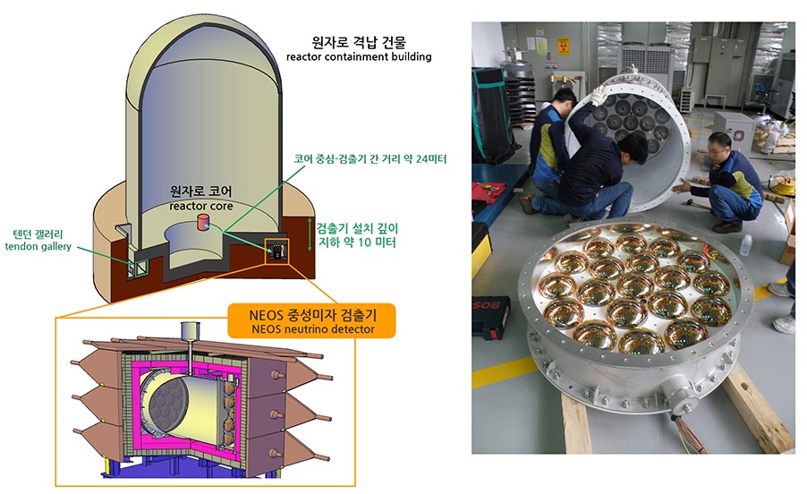 NEOS探測器結構(右)及其在反應堆內部安裝的示意圖