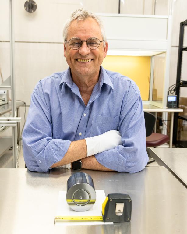 ORNL 的 David Radford 展示了他設(shè)計(jì)的鍺探測(cè)器(其中央觸點(diǎn)在 3 英寸標(biāo)記處可見(jiàn)),這對(duì) LEGEND 研究工作至關(guān)重要。圖片來(lái)源:Carlos Jones/ORNL,美國(guó)能源部