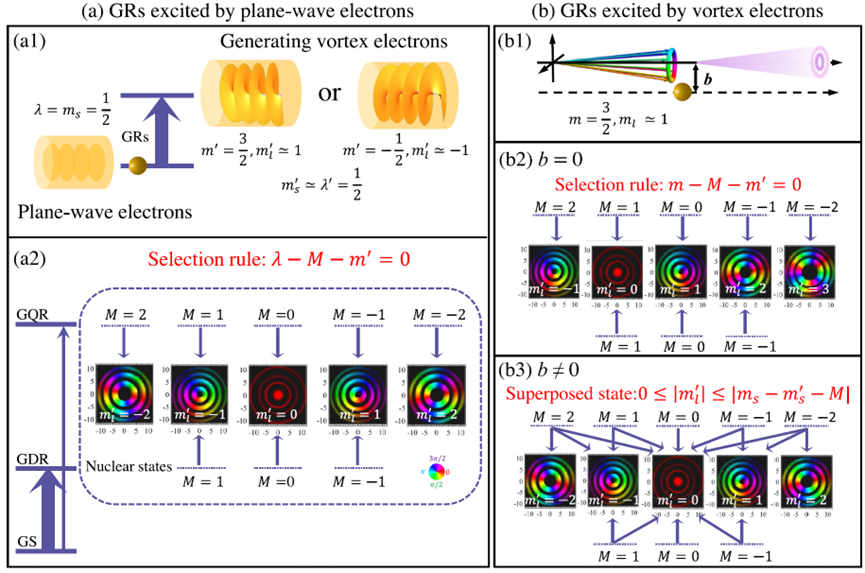 圖:平面波電子(a)和渦旋電子(b)激發原子核的示意圖