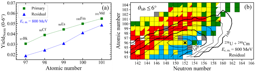 該研究發現多核子轉移反應238U + 248Cm的錒系同位素產物在θlab = 0°附近呈現明顯產額優勢,且小角度區域產額占比隨原子序數增加呈上升趨勢,部分未知豐中子錒系核素的產生截面超過了1納靶。該研究結果為優化多核子轉移反應的實驗設計提供了新思路,拓展了充氣反沖譜儀和真空電磁譜儀在多核子轉移核反應研究中的應用場景,也將為探索‘超重穩定島’的實驗研究提供理論指導。