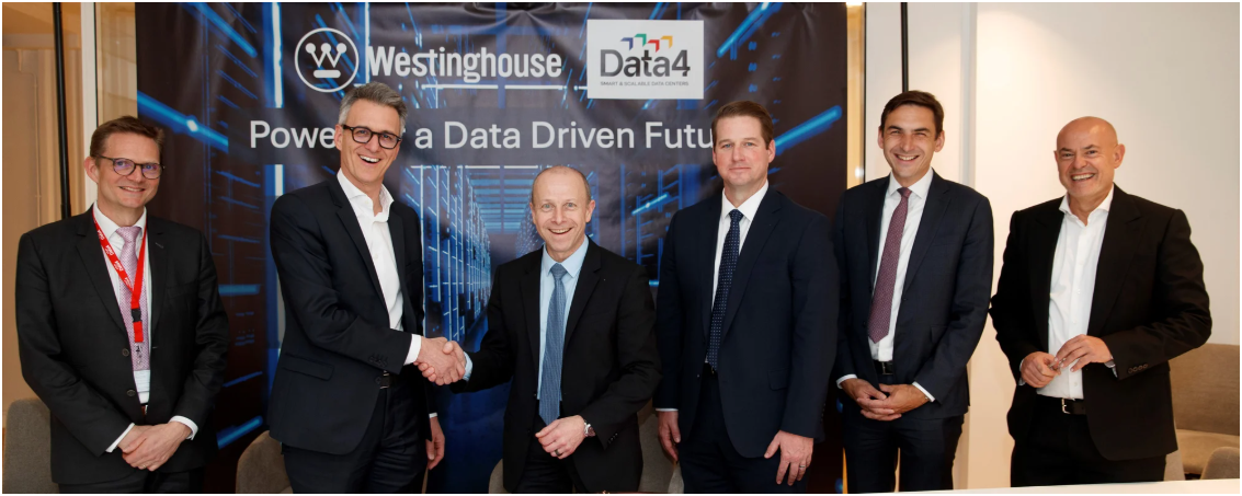 西屋電氣總裁兼首席執(zhí)行官 Patrick Fragman(左三)和 Data4 首席執(zhí)行官 Olivier Micheli(左二)與西屋電氣和 Data4 領(lǐng)導(dǎo)人(包括副首席執(zhí)行官 Dan Sumner(右三))一起簽署了諒解備忘錄。