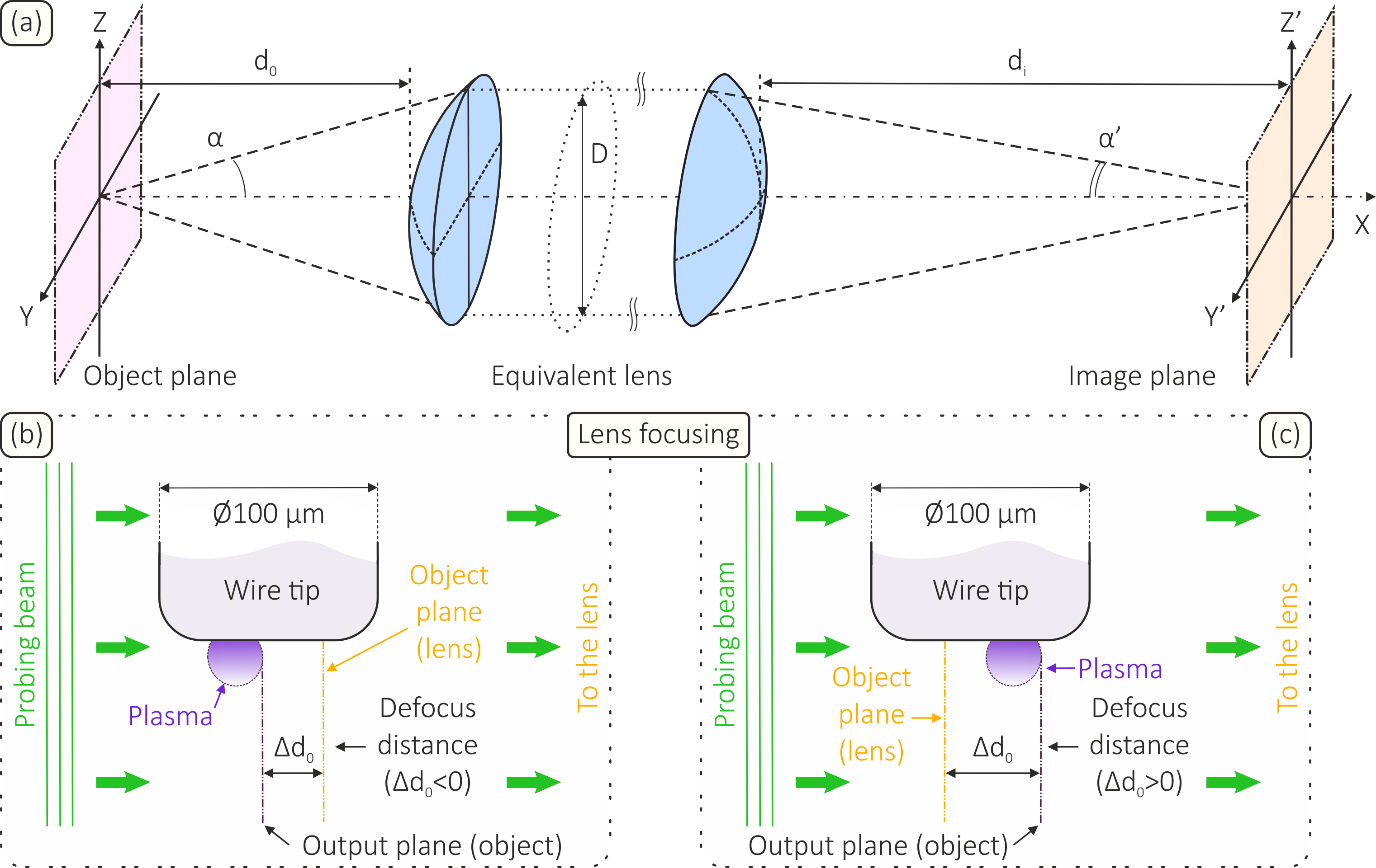 圖 2. 等效透鏡 (a) 形式的光學(xué)配準(zhǔn)系統(tǒng)示意圖。等效透鏡聚焦于尖端電極上的示意圖,尖端電極上形成有小的等離子體,離焦距離為?d0:如果透鏡的物面位于等離子體物體的輸出平面后面(b),則該距離小于零;如果透鏡的物面位于等離子體物體的輸出平面前面(c),則該距離大于零。資料來源:Physical Review E。