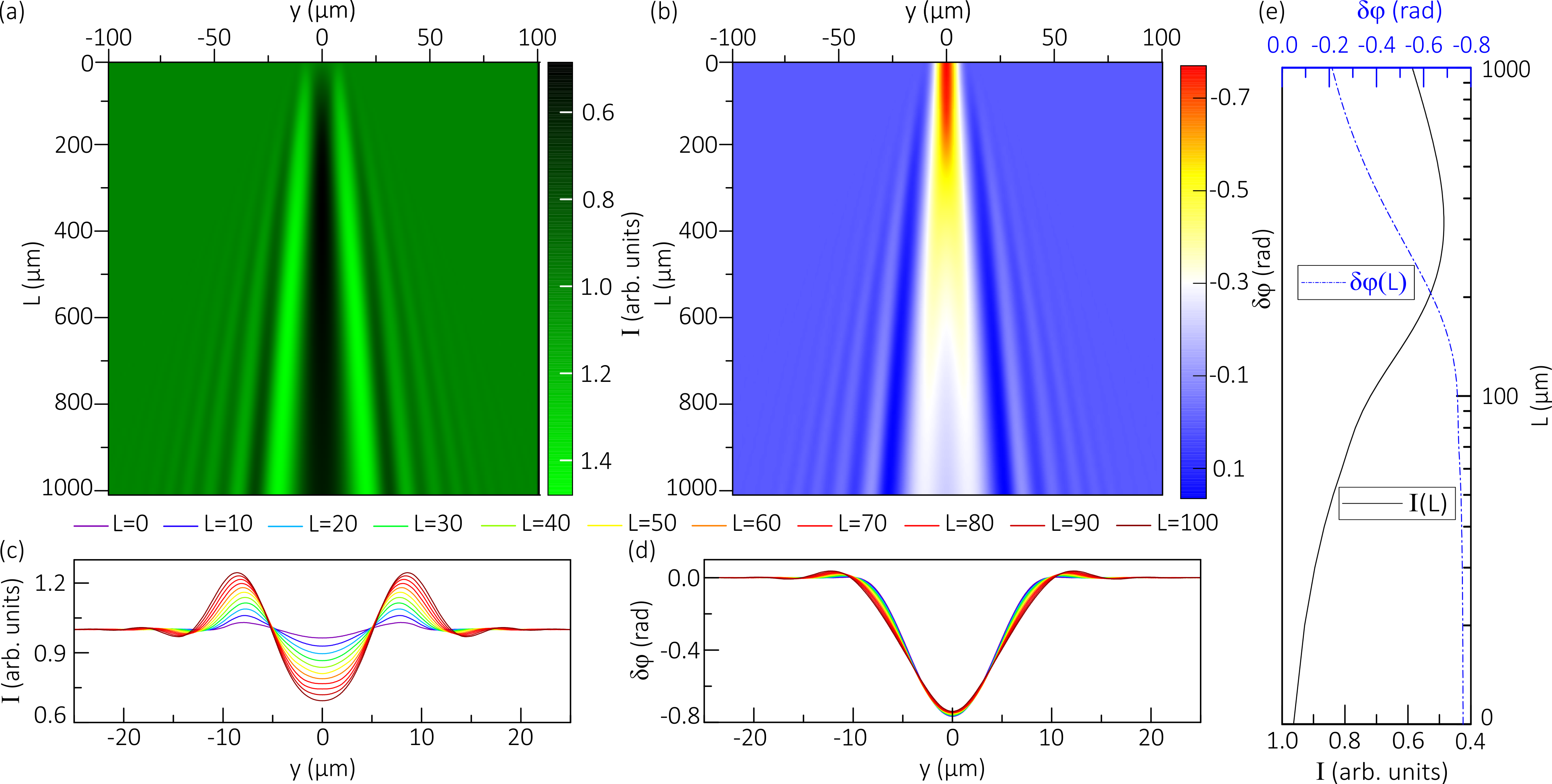 圖 3. 平面波(波長為 532 nm)的強(qiáng)度 (a) 和相移 (b) 的衍射圖,模擬在直徑為 20 μm 的等離子絲后面,距離最遠(yuǎn)可達(dá) L=1 cm(相對于等離子物體的輸出平面)。圖示物體后方在外圍方向上的衍射波的強(qiáng)度(c)和相移(d)的行為,以及沿坐標(biāo) y=0 平面上的傳播(e)的行為。 在物體后方探測光束傳播方向上輻射衍射(以激光輻射強(qiáng)度的變化表示)的亮度圖案的特點(diǎn)是波強(qiáng)度明顯下降(等離子絲充當(dāng)負(fù)圓柱透鏡),而在外圍,該圖案由交替的小尺度區(qū)域表示,輻射強(qiáng)度增加或減少,適合衍射錐,其頂點(diǎn)的角度與包含等離子體物體的區(qū)域重合。輻射衍射的相位圖也具有眾多波動的特點(diǎn),其最大值在物體的輸出平面中實(shí)現(xiàn)。隨著與物體距離的增加,由于衍射效應(yīng)增強(qiáng),物體的亮度和相位模式變得更加扭曲。資料來源:Physical Review E。