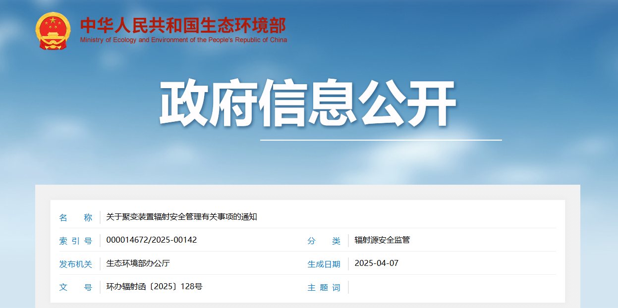 4月2日,生態環境部辦公廳發布《關于聚變裝置輻射安全管理有關事項的通知》(以下簡稱《通知》),旨在進一步規范聚變裝置輻射安全監管工作。