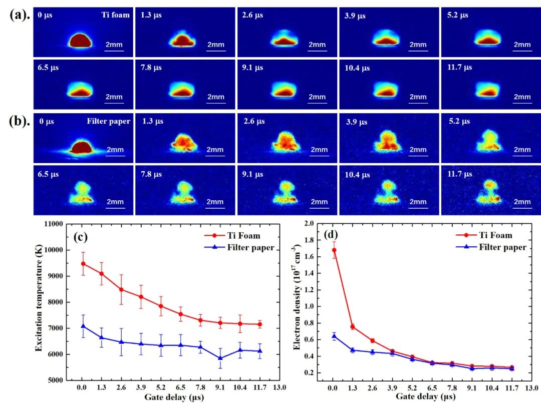 針對以上問題,原子能院激光光譜研究團隊提出毛細效應(yīng)增強激光誘導(dǎo)擊穿光譜新方法。該方法以多孔泡沫鈦作為富集基底,將泡沫鈦浸泡在溶液中,利用毛細力自驅(qū)動作用,使溶質(zhì)隨溶液沿微孔向上遷移并在基底表面富集。研究結(jié)果表明,采用泡沫鈦基底進行溶質(zhì)富集后,溶質(zhì)在基底表面均勻分布,“咖啡環(huán)”效應(yīng)得到有效抑制。與傳統(tǒng)濾紙基底相比,采用泡沫鈦基底富集后,激光誘導(dǎo)等離子體演化穩(wěn)定性顯著提升,等離子體溫度、電子密度同步提高,等離子體輻射光譜強度顯著增強。