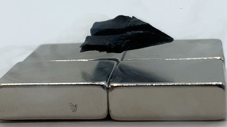 一顆由單粒種子3D打印而成的超導體樣品——形狀像一架紙飛機——懸浮在磁鐵上方。圖片來源:張鼎昌