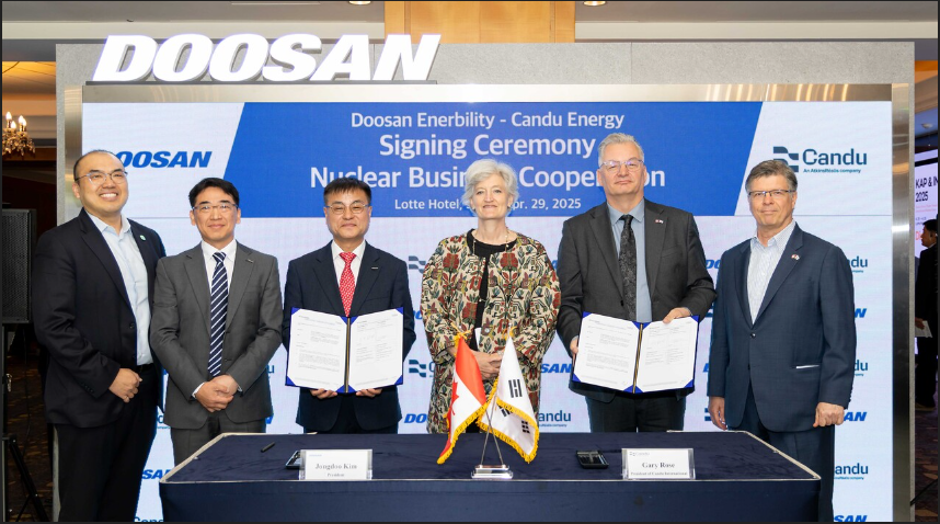 4月29日,斗山能源宣布與加拿大核電公司Candu Energy簽署核電業務領域合作優先供應商協議,簽字儀式于首爾中區樂天酒店舉行,Candu Energy總裁Gary Rose(加里·羅斯)、斗山能源核能BG負責人Jongdoo Kim(金鐘斗)等兩家公司官員出席了儀式。
