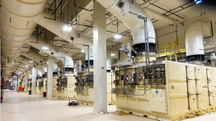 從系統(tǒng)構(gòu)成來看,SSCVS由兩座主要建筑組成。一座是鹽減量建筑,其作用是對來自地下儲存設(shè)施的含鹽空氣進行預(yù)先過濾;另一座是新過濾建筑,內(nèi)部裝有風(fēng)扇和22個HEPA過濾器。新系統(tǒng)啟用后,地下空氣流量將從目前的每分鐘170,000立方英尺(約4,814立方米)大幅提升至每分鐘540,000立方英尺,顯著改善地下作業(yè)環(huán)境。
