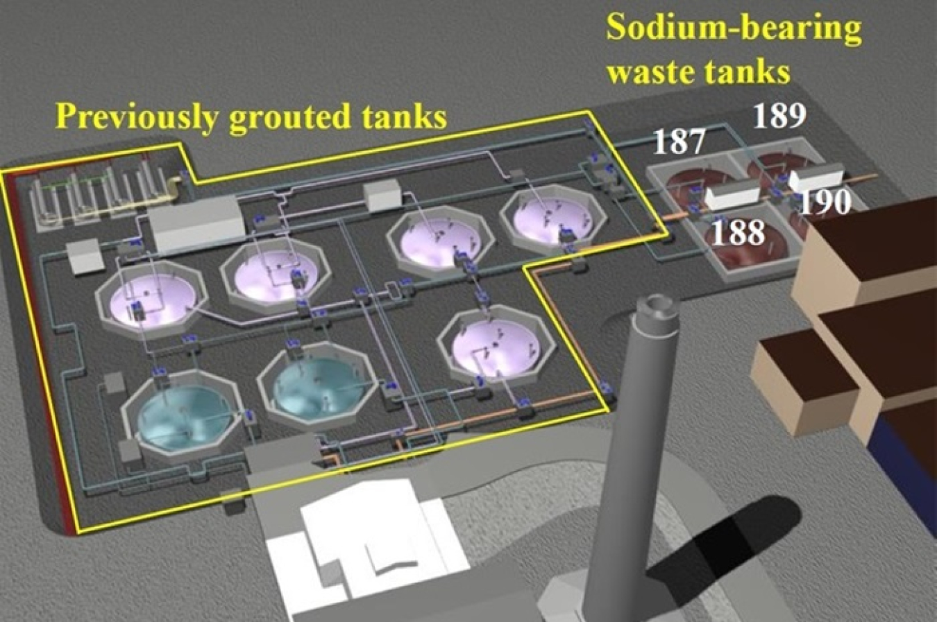 罐區(qū)內(nèi)的液體廢物產(chǎn)生于乏核燃料后處理線的凈化過(guò)程。IWTU的建造目的是運(yùn)用蒸汽重整技術(shù),將三個(gè)儲(chǔ)罐中約90萬(wàn)加侖的廢物轉(zhuǎn)化為更穩(wěn)定的顆粒狀固體。截至目前,IWTU已處理了27.9萬(wàn)加侖的廢物。這些廢物轉(zhuǎn)化為固體后,會(huì)被轉(zhuǎn)移至不銹鋼罐中,再裝入混凝土儲(chǔ)藏室,并儲(chǔ)存在現(xiàn)場(chǎng)的產(chǎn)品儲(chǔ)存建筑內(nèi),直至有永久處置庫(kù)可供使用。