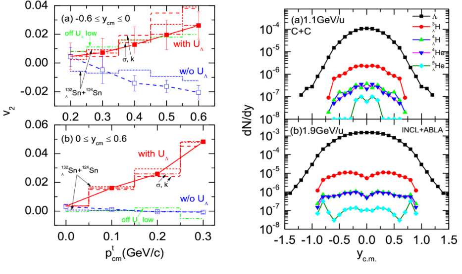 左圖:超核-原子核碰撞中的超子橢圓流隨橫動(dòng)量的變化情況。上窗口對(duì)應(yīng)負(fù)快度,下窗口對(duì)應(yīng)正快度。圖中展示了不同重子散射截面、不同物態(tài)方程、超子勢(shì)的不同密度區(qū)間,以及不同的反應(yīng)系統(tǒng)對(duì)超子橢圓流的影響。右圖:碳碳碰撞中的輕超核產(chǎn)生的快度分布。上窗口對(duì)應(yīng)1.1 GeV每核子束流能的情況,下窗口對(duì)應(yīng)的是1.9 GeV情況。