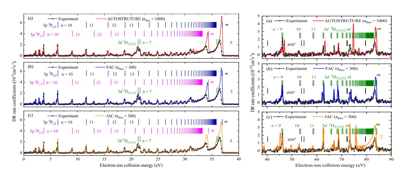 基于蘭州重離子加速器冷卻儲存環開展的高電荷態離子的雙電子復合精密譜學實驗具有較高的能量分辨,且其電子-離子相對能量可大范圍精密調制,是目前唯一能夠精確測量低能碰撞復合截面關鍵數據的實驗方法。科研團隊在對M殼層類鈉鐵離子 Fe15+的實驗中,成功測量了 0-90 eV 能量范圍內的復合速率系數。他們將實驗結果與最新的理論Flexible Atomic Code (FAC) 、AUTOSTRUCTURE、Jena Atomic Calculator (JAC)計算的結果仔細對比,解析出每個共振結構的來源。同時,科研人員從雙電子復合速率系數得到了可用于等離子體建模的等離子體速率系數,并與此前的理論數據作了對比研究。