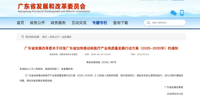 《通知》的總體目標為:“到2030年,我省核醫療產業自主創新能力顯著提升,突破一批關鍵技術,建設一批創新平臺,常用醫用同位素實現穩定供應,一批放射性藥物和高端核醫療裝備完成或進入臨床試驗,三級綜合醫院基本實現核醫學科全覆蓋,培育3-5家在全國范圍內具有示范引領作用的核醫療龍頭企業和一批專精特新企業,打造形成具有全球競爭力的核醫療產業集群。”