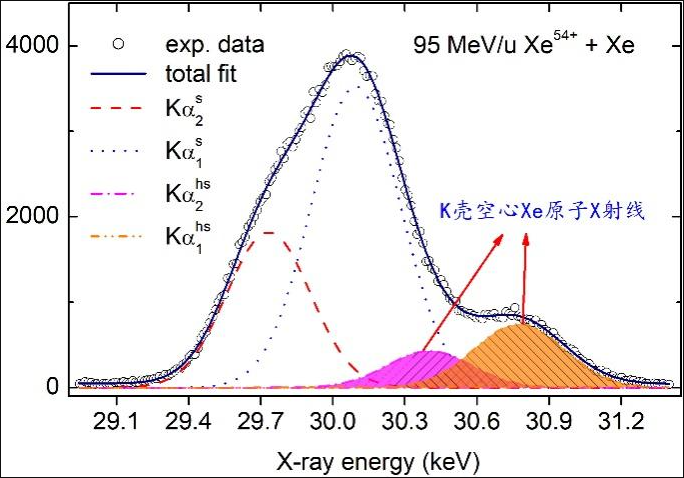 針對高效制備重空心原子并對其進行系統性研究的難題,科研團隊在蘭州重離子加速器冷卻儲存環(HIRFL-CSR)及其氣體內靶裝置上開展了相關實驗,利用能量95-197 MeV/u的全裸氙離子與氙靶碰撞,測量了反應后靶原子的X射線譜。研究發現,得益于全裸氙離子所攜帶的強庫侖場及對稱碰撞中內殼電子轉移過程,空心氙原子的相對產額相比K殼單空穴氙原子最高可達28.6%。該研究表明全裸重離子-原子碰撞是高產額制備重空心原子的有效途徑。