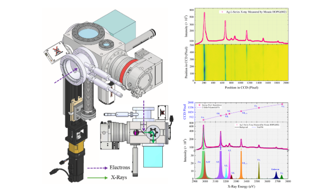 為進一步研究這類空心原子的產生與退激特性,科研人員自主研發了用于多空穴離子X射線精細結構測量的緊湊型寬帶高分辨平面晶體譜儀。該譜儀采用了針對多空穴離子X射線譜特點的獨特幾何構型,通過靶平動伴隨晶體同步轉動,大幅提升了譜儀調節精準度和便捷性。此外,該譜儀在緊湊的空間內實現了0.53-19.3 keV的動態范圍及0.04-6.58 keV的單次曝光帶寬,全動態范圍內的能譜分辨力好于102,采用馬賽克晶體時的探測效率較傳統平面晶體譜儀提高了20倍以上。