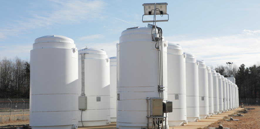 高燃耗研究容器(中)與其他乏核燃料干式儲存容器一起矗立在弗吉尼亞州北安娜核電站。(圖片:Dominion Energy)
