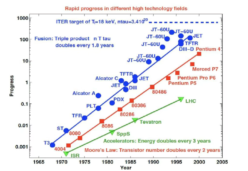 而在核聚變領域,以托卡馬克為例:2000年之前,聚變?nèi)朔e的增長速度基本保持每隔1.8年翻番,這一速度超過芯片領域的“摩爾定律”,也超過加速器發(fā)展增速。